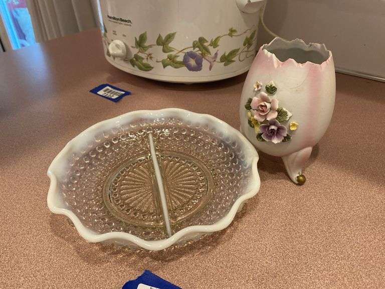 LOT 7121 - Opalescent hobnail divided dish, Lefton egg repaired