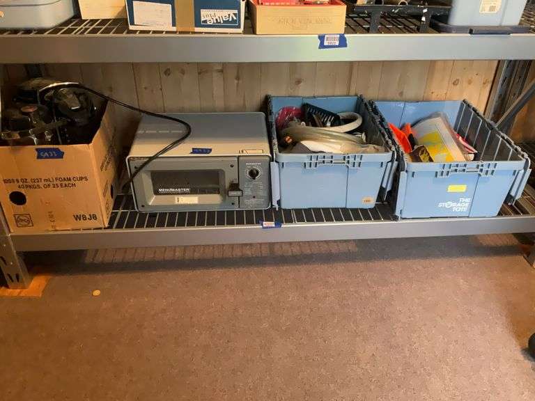 LOT 5922 - Contents of shelf: MenuMaster commercial microwave, totes, misc