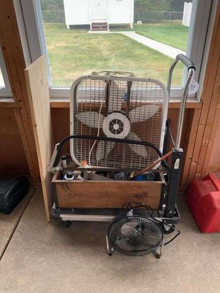 LOT 5887 - Cart/dolly, box fan, table fan, bow saw, pry bar, misc