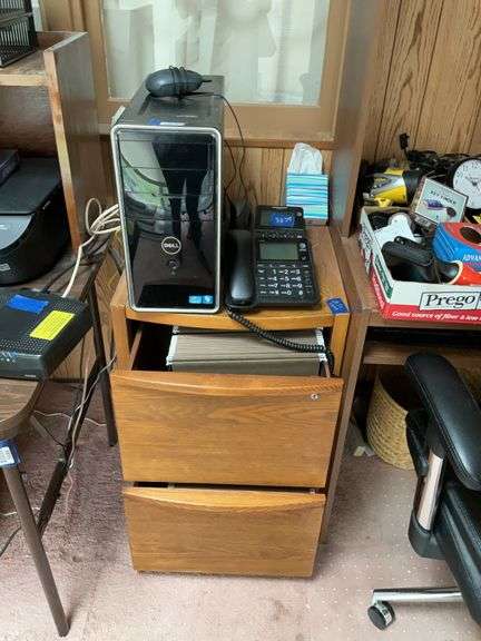 LOT 5679 - 2-drawer hanging file cabinet and contents: Dell computer tower, two AT&T desk telephones