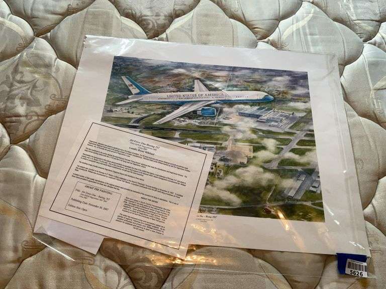 LOT 5626 - Landis Brent Whitsel print: Air Force One Boeing 757 over Hagerstown MD, framed, w/ certificate