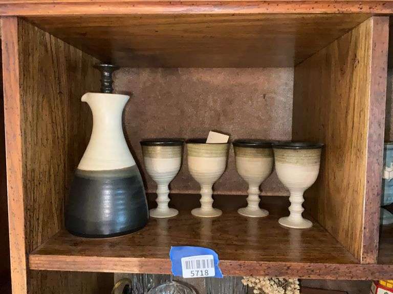 LOT 5718 - Contents of shelf: studio stoneware decanter and four wines