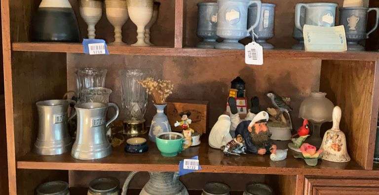 LOT 5722 - Contents of shelf: Bicentennial mugs, electric accent lamps, figurines, candle lamp, jasperware vase, misc