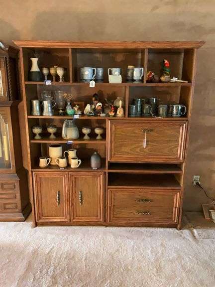 LOT 5726 - Wall unit w/ open shelving, fall front cabinet and cupboards - no contents 59x14x71 - MUST COME DURING LAST 2 HOURS OF PICKUP FOR THIS ITEM