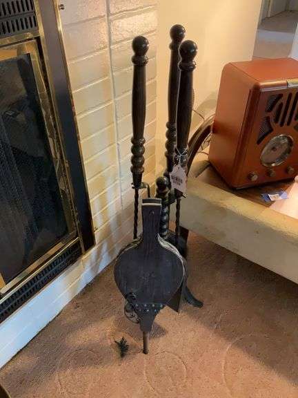 LOT 5739 - Wood handled fireplace tools on rack and bellows