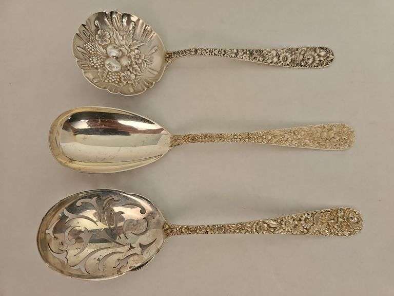 LOT 1863 - S. Kirk & Son Sterling Repousse - Bon bon Spoon, Two Serving spoons (one pierced) by the pc take 3 - Not at Auction Property but will be Available for Viewing at Preview & Pick Up