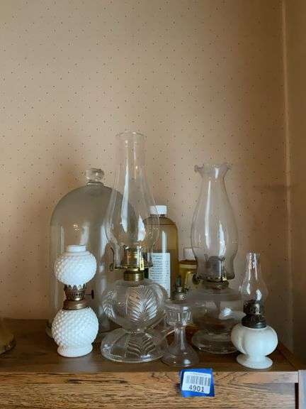 LOT 4901 - Glass hand oil lamps, milk glass and clear miniature oil lamps, glass cloche dome, bottles of lamp oil