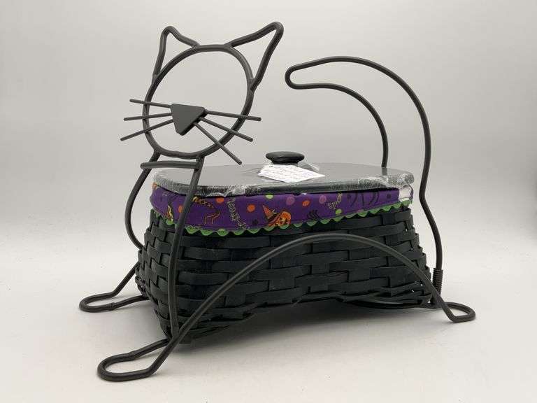 LOT 1728 - Black wrought iron cat and black cat basket liner, protector and lid