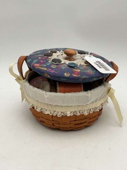 LOT 1886 - 1993 button basket liner, protector lid and spools of thread