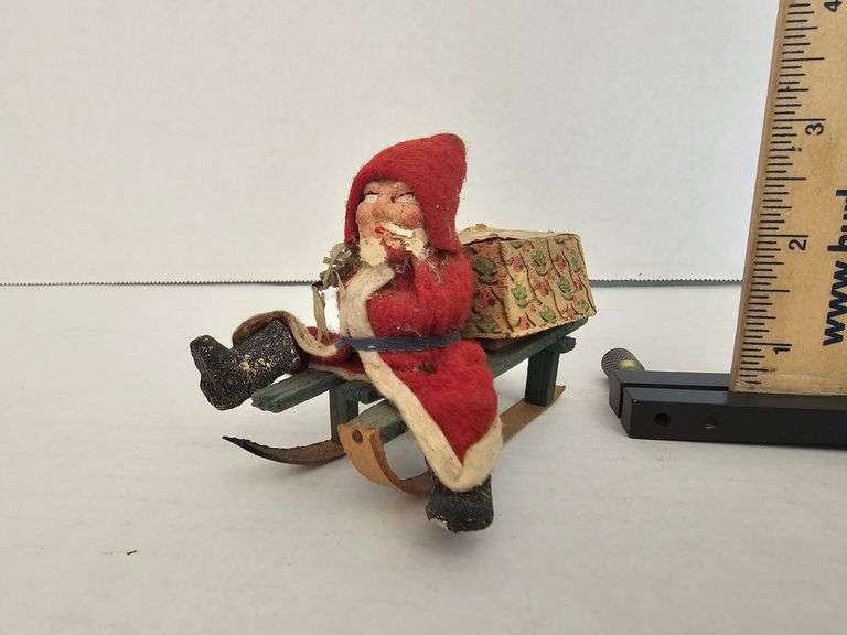 LOT 1920 - Turn of the Century papier mache’ Santa on a sled w/ Merry Christmas package marked Germany