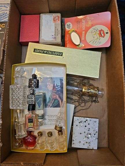 LOT 2091 - Vintage lot - Rare glass beaded automobile bud vase, Perfume bottles some sterling, purse hand mirror, hinged purse change holder, lipstick mirror, NIB Bosom Friend money holder & more