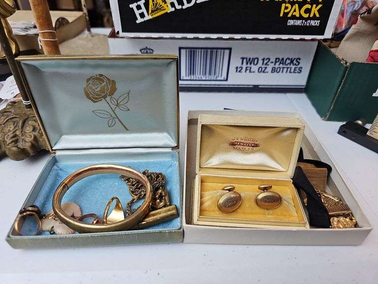 LOT 2116 - Gold filled jewelry - monogrammed cuff links, vest pocket slide watch chain w/ ornate fobs, bracelet & rings - inspection suggested