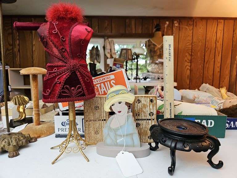 LOT 2146 - Display items - metal finial, pair of wooden dominoes in the rough, countertop rack & more