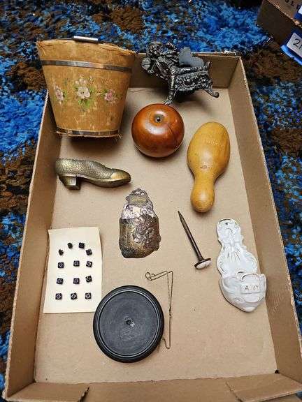 LOT 2169 - Shoe in cushion, match safes, foot form darner, cast metal calling card holder, small sewing bucket