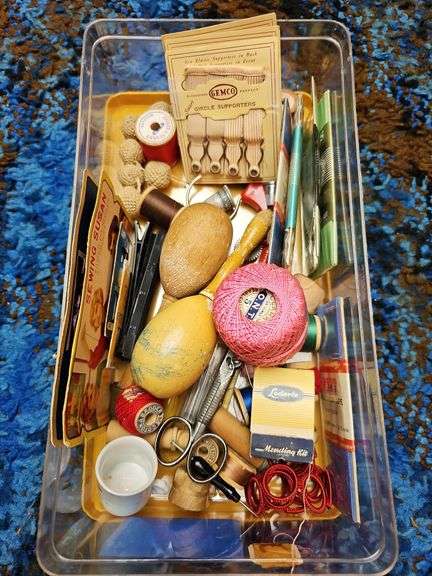 LOT 2175 - Misc lot of sewing notions - Darners, Sewing Susan needle book,, darners, thimbles, scissors, thread, Singer Sewing How-To Library & more