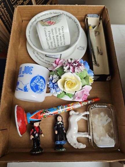 LOT 5556 - Misc Lot - Child’s Ranger Joe mug, 3-pc Royal Doulton Bone China Bunny-Kins plate, cup & bowl, vintage Halloween horn, fishing lure & more