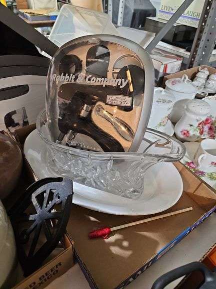 LOT 2273 - Rabbit & Co corkscrew wine bottle opener in case, Gorham Crystal wine bottle serving bucket,