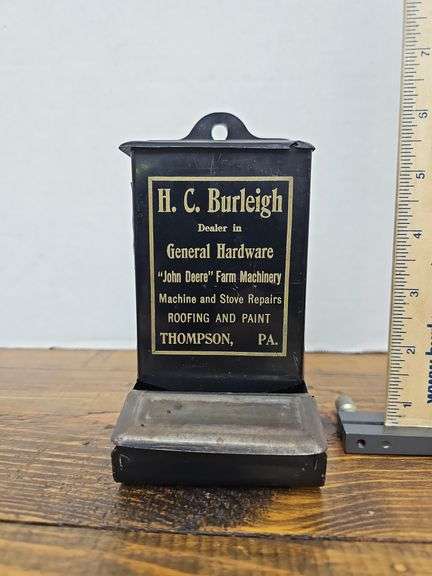 LOT 1895 - Metal wall mount advertising match box H C Budleigh General Hardware, Thompson, Pa & two Bisque Match Holders - Riding Boots & Lady by the Pot Bellied Stove