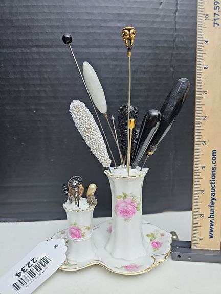 LOT 2234 - A Rare Find - Porcelain China Hand Painted Double Hat Pin Holder w/ Hat Pins