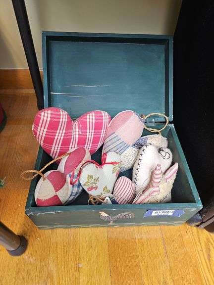 LOT 5763 - Hand crafted hearts & star w/ small hinged wooden rooster decorated chest