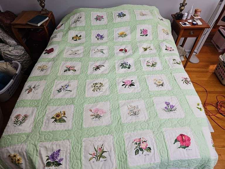 LOT 5778 - Beautiful Cross Stitch “U.S. State Flowers” Quilted Blanket, Full Size