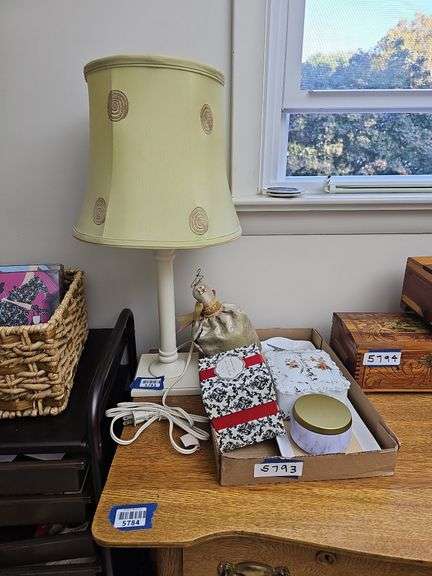 LOT 5793 - Table Lamp 22 in h & Misc Lot - two jar candles, milk glass dresser dish shows wear, & more