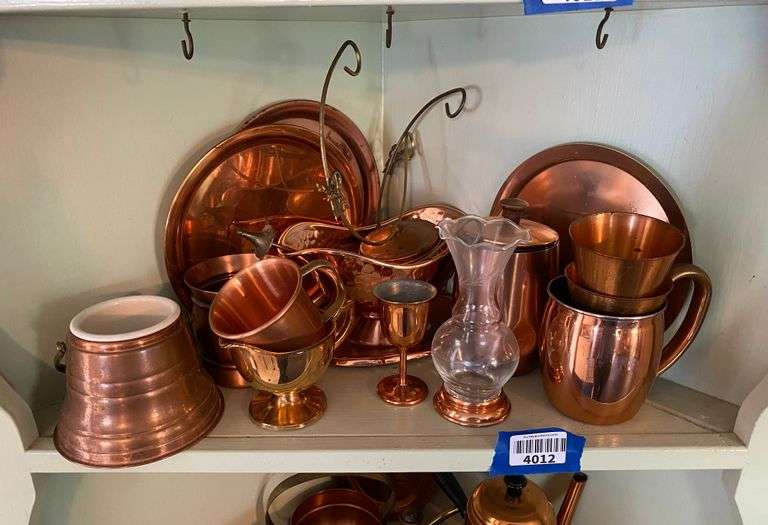LOT 4012 - Contents of shelf: copperware trays, mugs, bud vase, misc