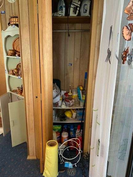 LOT 4017 - Contents of closet: irons, hangers, kitchenware, tissues, floor cleaners, household products, misc