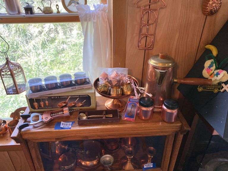 LOT 4030 - Contents of shelf: copper coffeepot, pedestal bowl, measuring scoops, misc