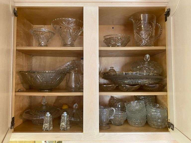 LOT 4054 - Contents of cupboard: pressed glass pitcher, bowls, serving pcs, pattern glass creamer, misc