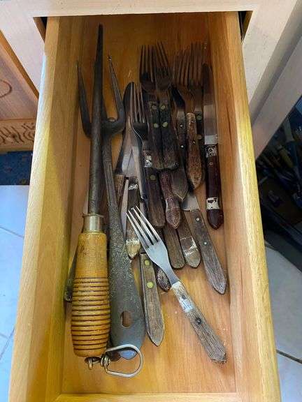 LOT 4060 - Contents of drawer: wood handled knives and forks, sharpening steel