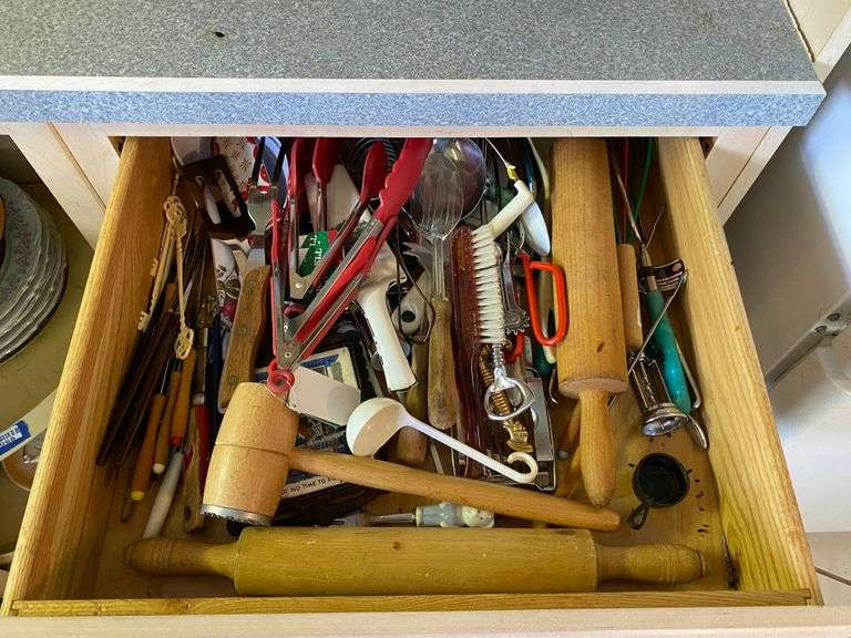 LOT 4069 - Contents of drawer: rolling pins, utensils