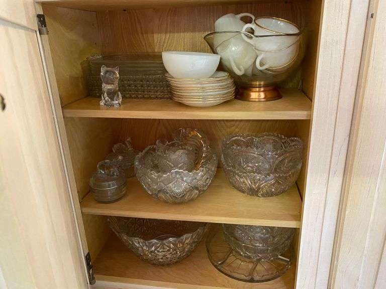 LOT 4072 - Contents of cupboard: Fire King cups & saucers, pressed glass bowls, figural dresser jars, bowl w/ copper foot