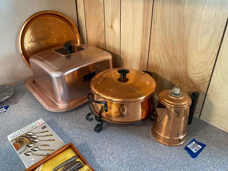 LOT 4079 - Copperware coffeepot, covered pan w/ wire rack, tray, copper tone cake keeper