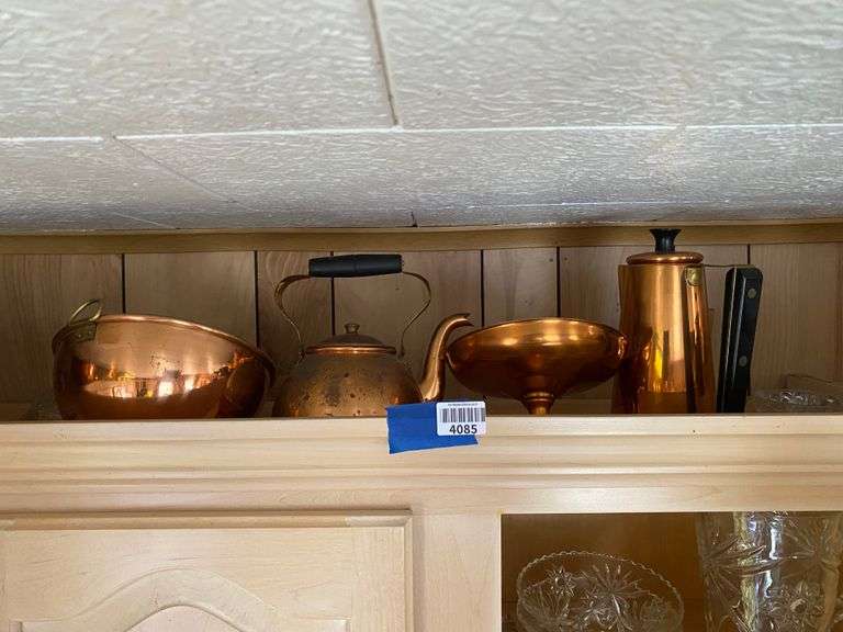 LOT 4085 - Copperware bowl, teakettle, footed dish, coffeepot