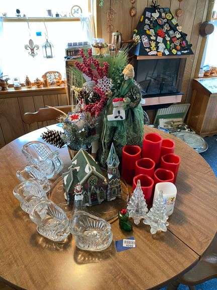 LOT 4090 - Christmas decor, model church, glass sleighs, battery candles, angel figure, decor items