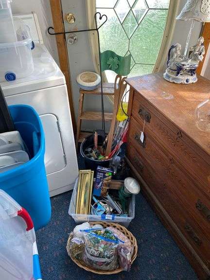 LOT 4102 - Folding step stool, garden stakes, glass globs, spotlight, mail slots, staple guns, tools, dog figure, misc