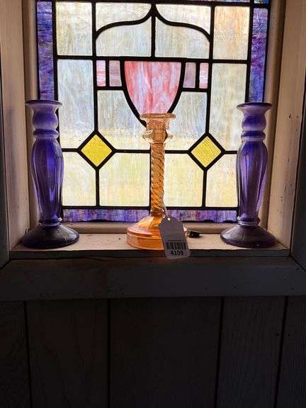 LOT 4109 - Contents of windowsill: marigold carnival glass candleholder, and pair of purple glass candleholders