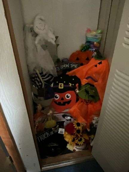 LOT 4143 - Contents of closet: Halloween decor lot, plastic Easter eggs