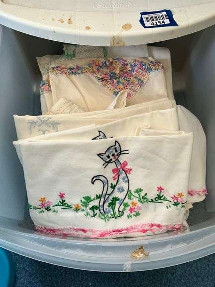 LOT 4154 - Vintage embroidered pillow cases w/ cats, other linens and crochet work