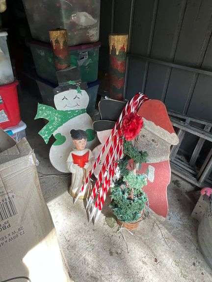 LOT 4232 - Blowmold choir boy, large vintage lighted Christmas candles, Santa and snowmen yard cutout decor, candy canes, lighted tree