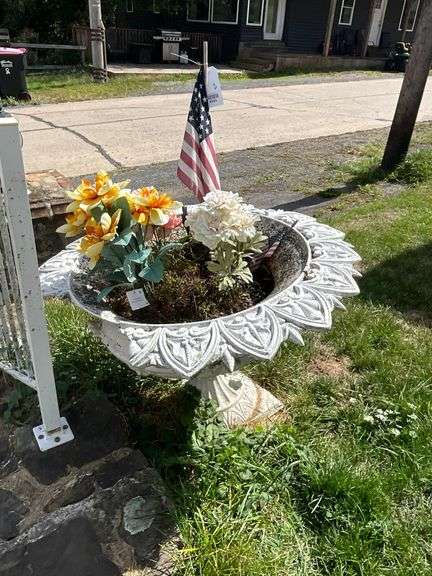 LOT 4241 - Pair of cast iron garden urns - note loss to flared rims