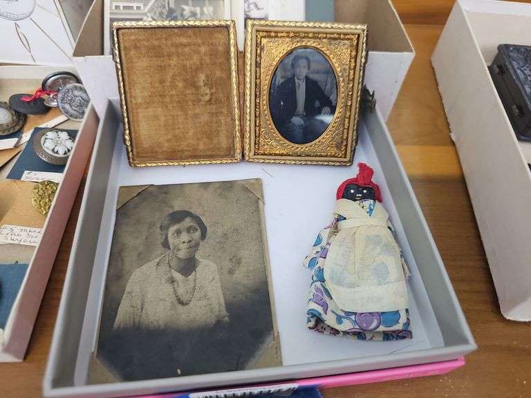 LOT 5882 - Unusual leather tintype case of young boy, B&W Negro lady photo, hand crafted miniature black doll