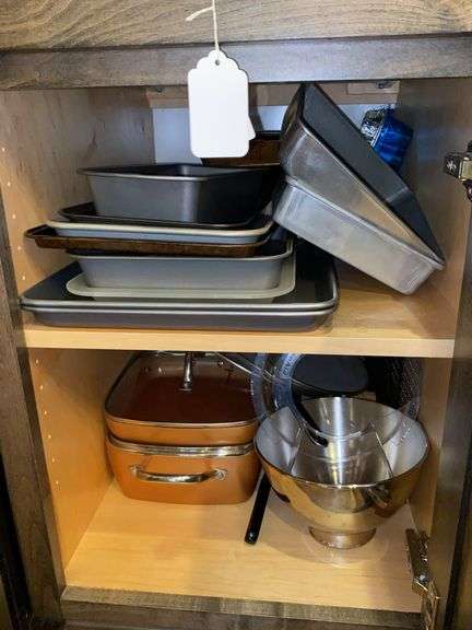 LOT 5354 - Contents of cupboard: Copper Chef cookware, baking pans, stainless bowl