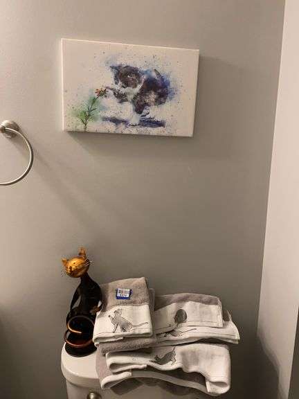 LOT 5374 - Cat theme wall art, wine bottle holder, and towels