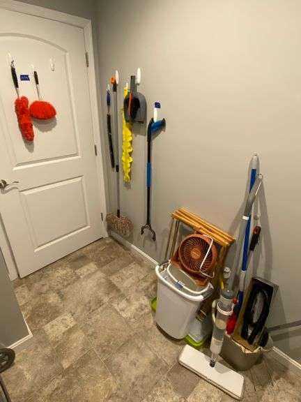 LOT 5379 - Folding drying rack, electric fan, plastic waste cans, cleaning tools lot