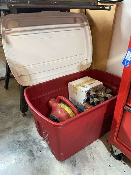 LOT 5633 - Tote and contents: Homelite blower head, propane heater top, parts drawer cabinet w/ contents, furniture movers
