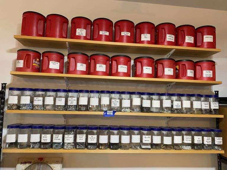 LOT 5642 - Contents of four shelves: containers of hardware and misc