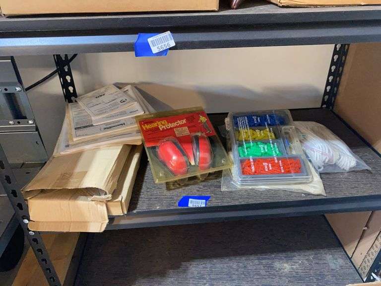 LOT 5657 - Contents of shelf: hearing & eye protectors, wall plugs, saw part