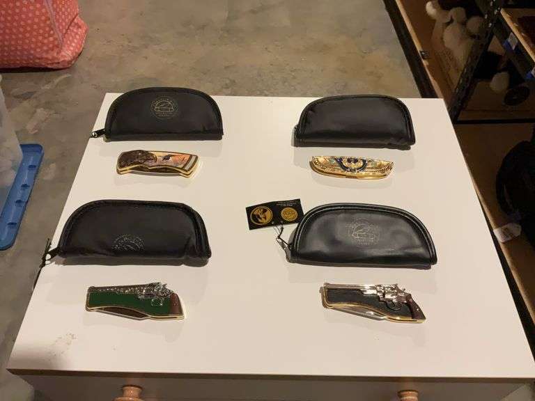 LOT 5513 - Four Franklin Mint collector pocket knives: bald eagle, two Smith & Wesson, Egyptian motif